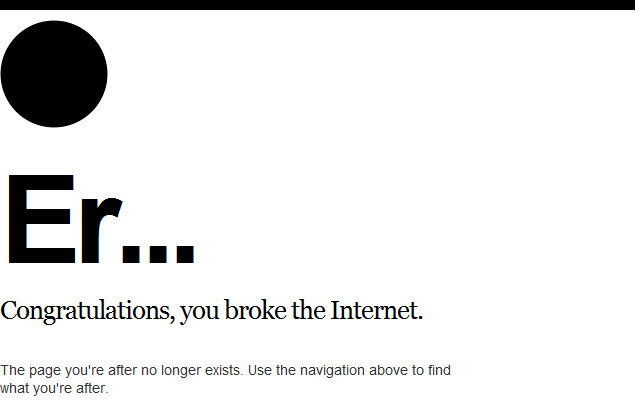Regardless, apparently 4/04 is the day to celebrate 404’s! In honor of that, Mashable posted some of the more creative options designed to inspire and humor (or aggravate and annoy) users. My two favorite: 1) Stormtroopers (on the site of a company that makes Star Wars costumes of all things), and 2) Broken Internet (on the site of Digitalmash, which is run by a Facebook product designer.) There are many more at this link: http://mashable.com/2012/04/04/funny-404-error-messages