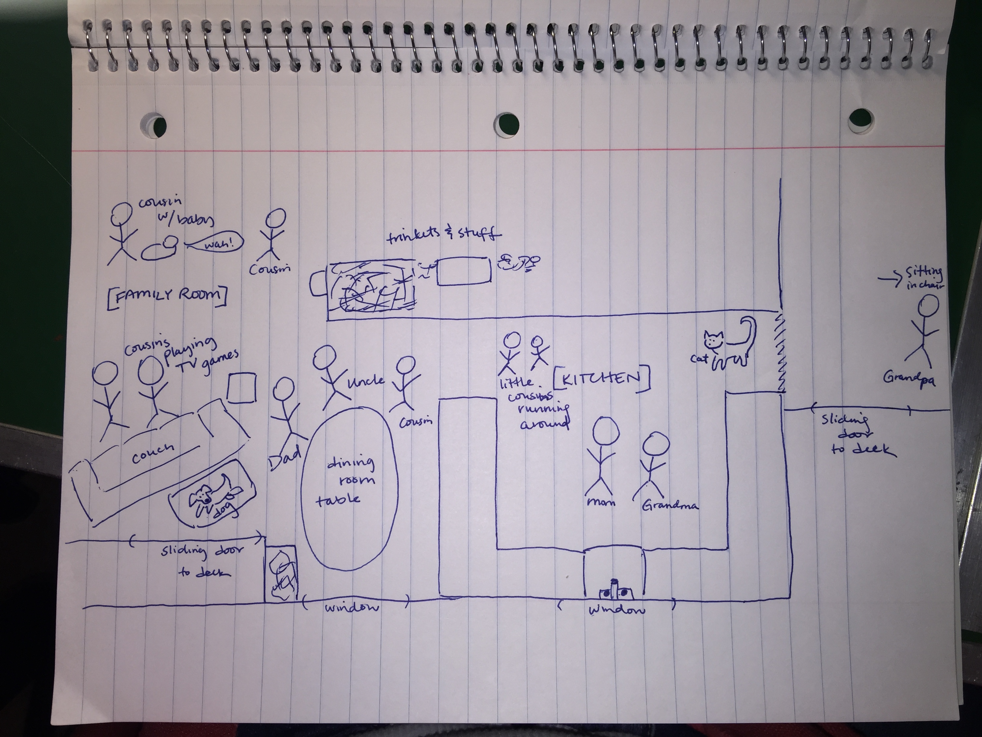 It is fitting that my visual map and narrative tour be centered around my family on this holiday. Like many families, mine had an Easter get-together – this year hosted at my grandparents’ house. The key attendees included my grandparents, parents, uncle, cousins, and myself (not to forget my grandparents’ dog and cat).